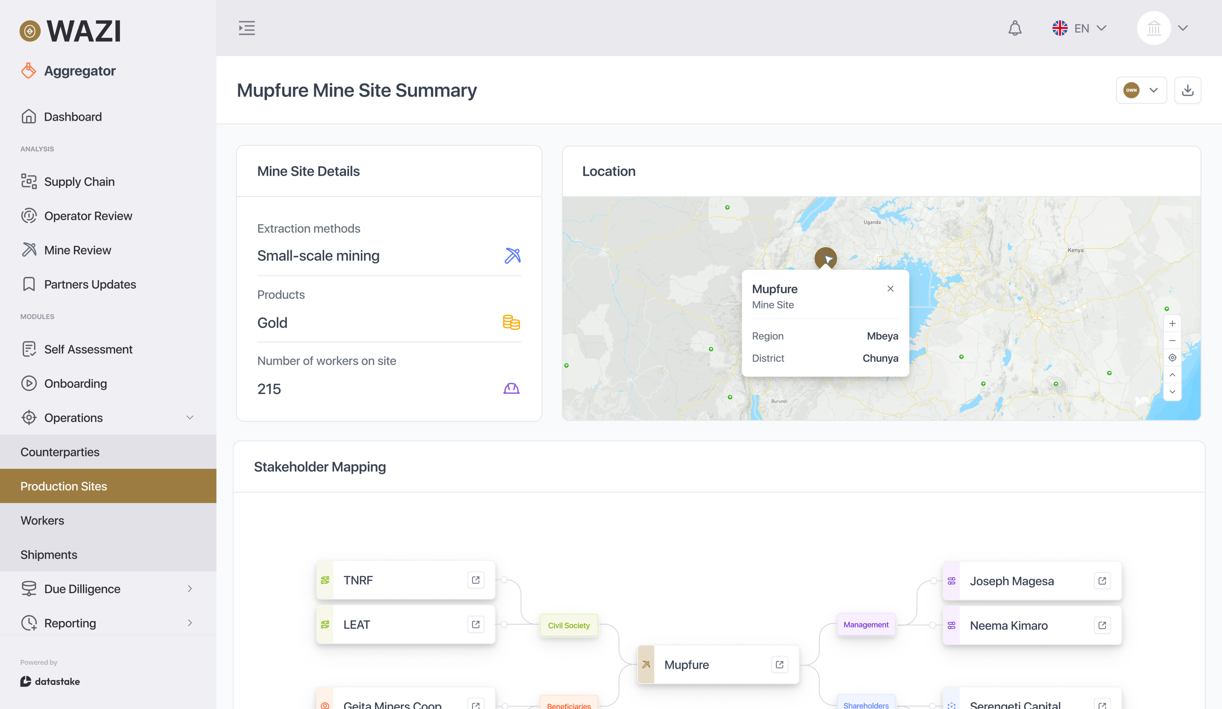 WAZI digitises the complex reality of artisanal and small-scale mining. Each step becomes a structured record that can be verified, monitored and shared securely. This makes due diligence continuous, collaborative and credible.